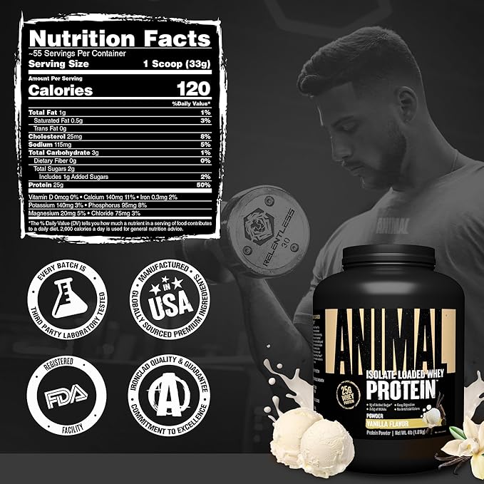 Animal Whey Isolate Protein Powder - Loaded for Pre & Post Workout Muscle Builder and Recovery with Digestive Enzymes for Men & Women - 25g Protein, Great Taste, Low Sugar - Vanilla 4 lbs