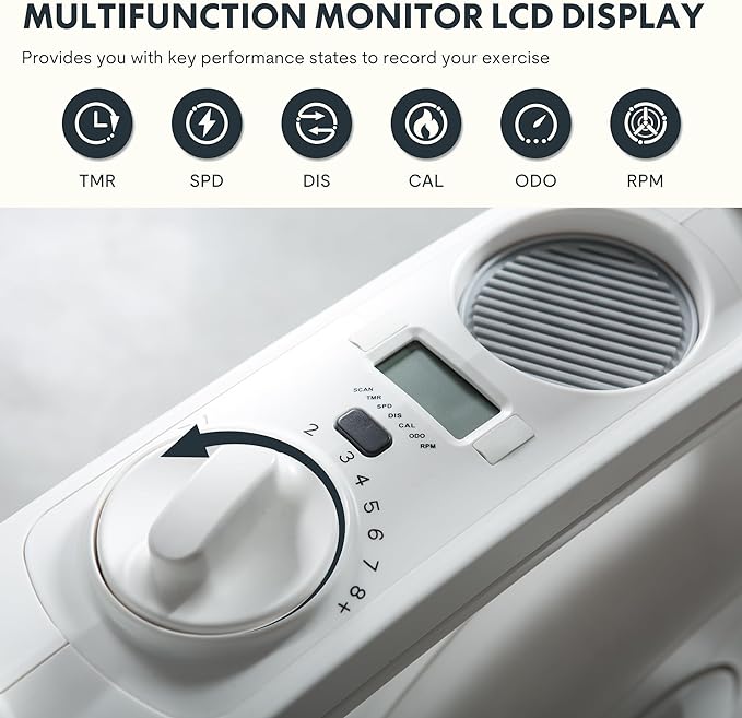 - ✅【LCD Exercise Tracker】Monitor your workout stats on the built-in LCD. Keep tabs on real-time data such as time, speed, distance, calories burned, total distance covered, and rotation speed.ATTENTION: the battery is not included