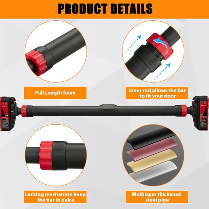 - 💪【MULTIPLE MUSCLE GROUP EXERCISES】For home gymbar exercise fitness allows you to perform a variety of upper body strengthening exercises, which are perfect for pull-ups, chin-ups, leg raises and more. You also can move the upper body workout bar down to the lower part of the doorway for dips, crunches and even stretching.