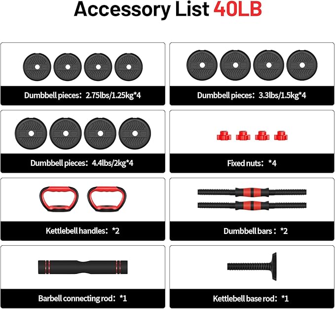 - WEIGHT PACKAGE LIST - 40 lbs fitness dumbbells include: 4 × 4.4lbs weight plates, 4x3.3lbs weight plates,4 × 2.75lbs weight plates,4x dumbbell nuts,1x connertor and 2x dumbbell bar. You can choose different weights according to your own preferences to meet the intensity needs of you and your family at different stages of exercise.