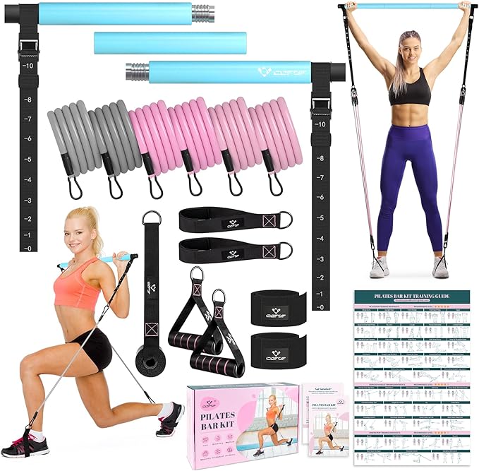 - [Superior Yoga Pilates Bar Kit]: COFOF Pilates bar composed of 3 steel pipes, with high-density non-slip protection pad, and can perform stable & safe exercises even if sweat during exercise. 6 resistance bands equipped are made of natural latex, and three kinds of resistance can be freely matched with different intensities to 20-150 LBS. 2 Handles have soft padding to prevent chafing against your skin, suitable for 5.2โ-5.8โtall beginners or professionals to practice.