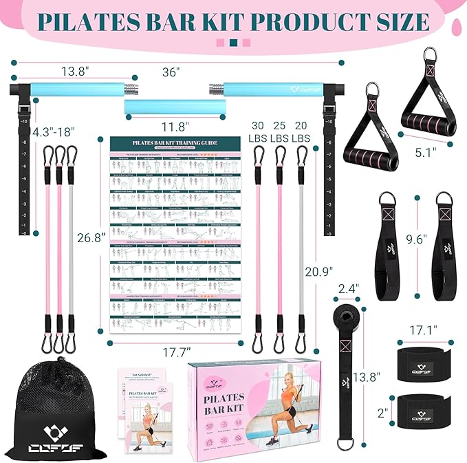- [COFOF Pilates Resistance Bar Kit]: Our portable pilates bar kit includes 3 sections of screwed steel pipes, 6 resistance bands can be replaced & combined, 2 handles with soft high-density padding, 2 foot straps, 1 door anchor, 2 Ankle Straps, and 1 portable bag. We provide pilates bar workout posters and detailed instruction. Any questions about quality or use method, we will quickly provide you with an answer. Your complete satisfaction is our ultimate goal.