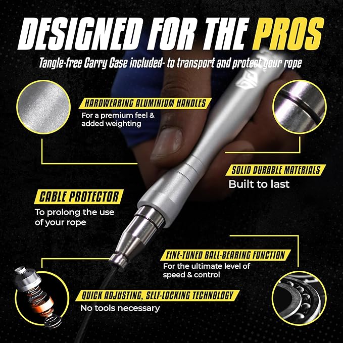- PREMIUM QUALITY & DESIGN – We’ve used the highest quality components to make our jump rope. Using ergonomically designed aluminium handles for durability and weight, two cable thicknesses for alternative levels of skipping, cable protectors to prolong the life and a tangle-free carry case.