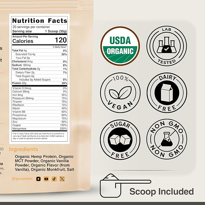- Certified USDA Organic: Trust in the integrity of our plant-based vegan protein powder, certified USDA Organic, non-GMO, and vegan-friendly. Our straightforward label and simple ingredients ensure transparency and quality. Protein sourced from all organic hemp seeds.