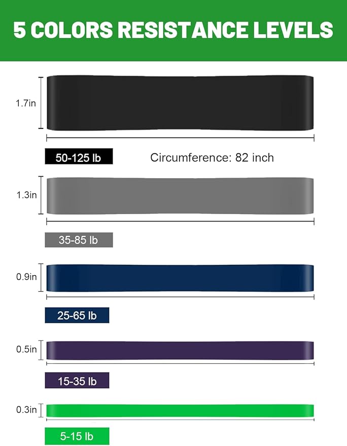 - Package Included: 5 pull up bands, 1 carrying bag and 1 workout guide. Resistance bands are 5-15 lbs, 15-35 lbs, 25-65 lbs, 35-85 lbs, 50-125 lbs. Use these exercise bands to perform rows, pulls, raises, and fly workout sets to exercise your arms, back, hips, legs, chest, and abdominal region