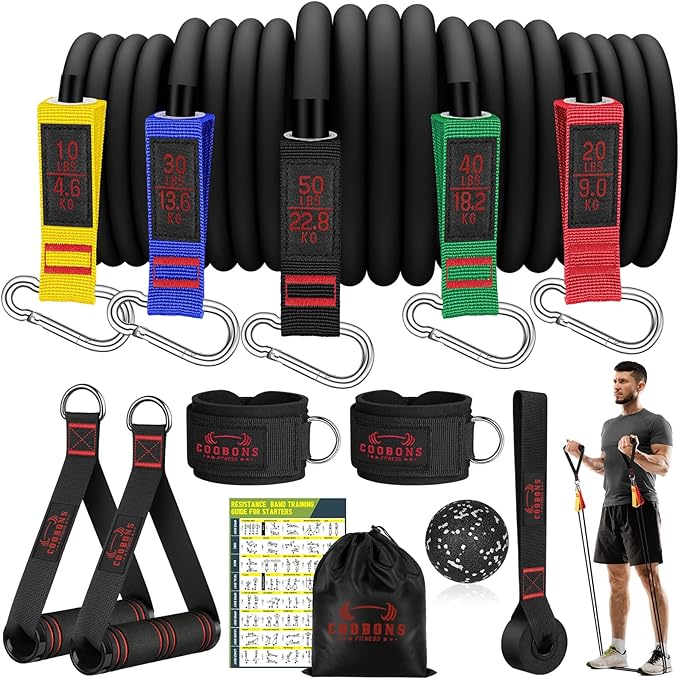- Adjustable Heavy Resistance Band: COOBONS Resistance Bands Set includes β Yellow (10 lbs), RED (20 lbs), Blue (30 lbs), Green (40 lbs), Black (50 lbs). Stackable exercise bands, both in 51", maximum resistance is 150 lbs.