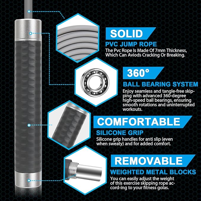 - Comfortable Grip: Experience a comfortable and secure hold with silicone grips, eliminating hand fatigue and allowing for extended exercise sessions.Our weighted jump rope for men and women helps reduce fatigue, burn fat, and enjoy the fun of jump ropes for fitness.