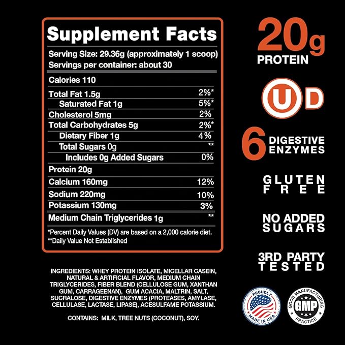 - EASY TO DIGEST: Formulated with a blend of six digestive enzymes and one full gram of MCT (medium chain triglycerides), our protein is gentle on the stomach.