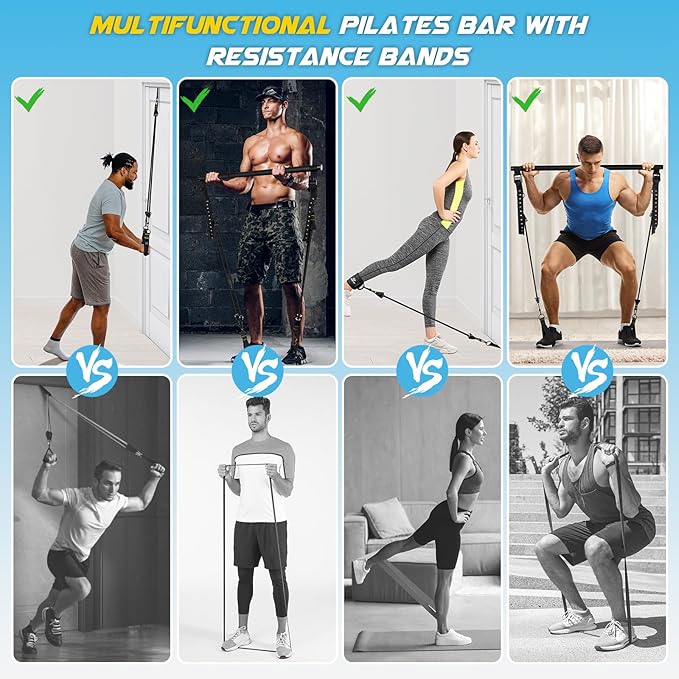 - [Multifunctional Pilates Bar Kit]: Pilates bar set with full accessory upgrades can be used for stretching, fitness and other training programs, exercising your arms, legs, buttocks, waist, neck and back. The perfect tool for building muscle and sculpting your body. 30lbs, 40lbs and 50lbs of resistance bands can be combined into 30lbs to 240lbs of resistance to meet the needs of various exercises. Door anchor, handles, and ankle straps enrich your exercise methods.