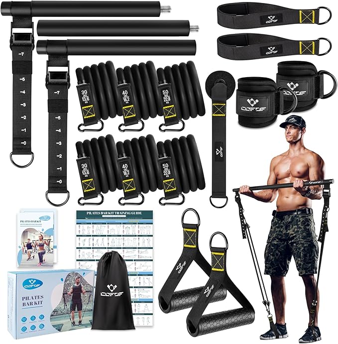 - [COFOF Pilates Resistance Bar Kit]: Our portable pilates bar kit includes 3 sections of solid metal threaded bars, 6 resistance bands can be replaced & combined, 2 handles & 2 foot straps, 1 door anchor, 2 Ankle Straps, and 1 portable bag. We provide pilates bar workout posters and detailed instruction. Any questions about quality or use method, please contact us promptly and we will get back to you within 24 hours. Your complete satisfaction is our ultimate goal.