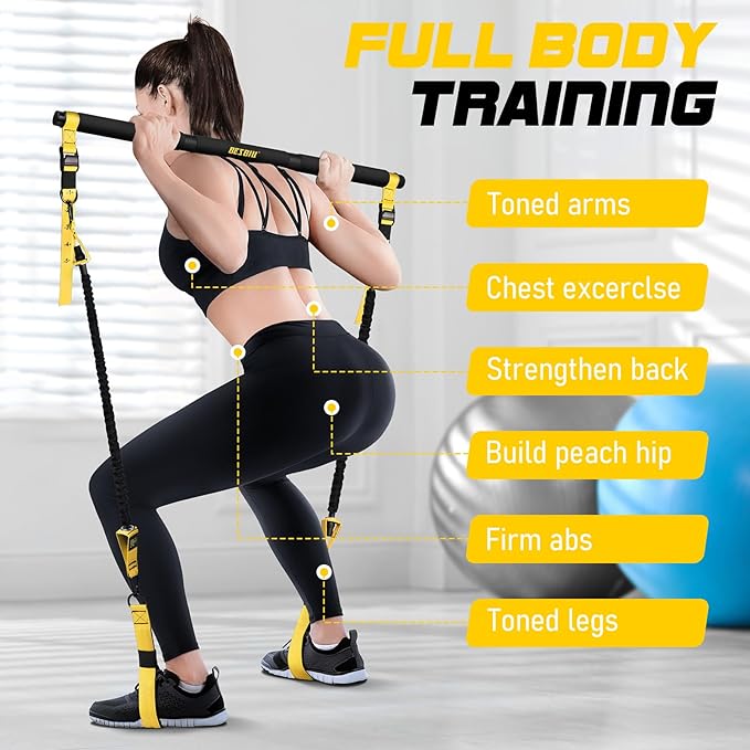 - FULL BODY WORKOUTS: The pilates bar kit with resistance bands can be used for yoga, pilates, stretching, resistance training, squats, weightlifting, etc. Targeting muscle groups in your neck, back, abs, shoulders, arms, upper body, glute, legs. The workout equipment is ideal for strength training, physical therapy, weight loss, body shaping, and flexibility. Great alternative to traditional strength training equipment or exercise equipment, like barbells, rowing machines, and bench presses