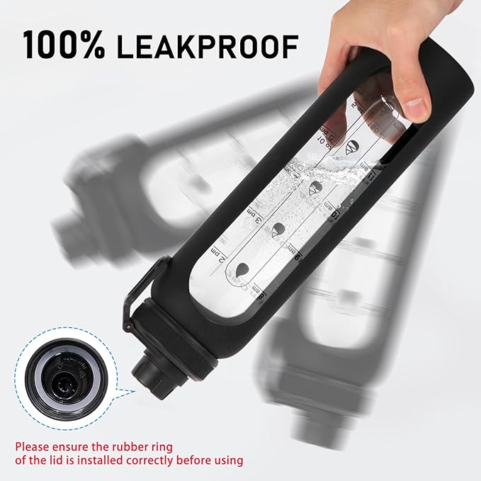 Glass Shaker Bottle 34oz/1L Black Glass Protein Shaker Bottle With Shaker Ball Large Shaker Bottles for Protein Mixes Portable Powder Mixer Blender Water Bottle for Gym Workout Sports