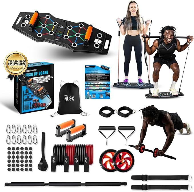 - Push Up Handles for Floor Versatility: Achieve the perfect pushup with pushup handles and a color-coded targeting system. This workout stuff transforms into a chest trainer for men and an all-in-one workout board. This set includes: push up board with hand grips, 2 x 20lbs resistance bands, 2 x 40lbs resistance bands, non-slip pad, 2 x dynamic handles, 2 x ankle straps, door anchor, extra carabiners, drawstring bag, plus 2 x ab roller wheels and a pilates bar!