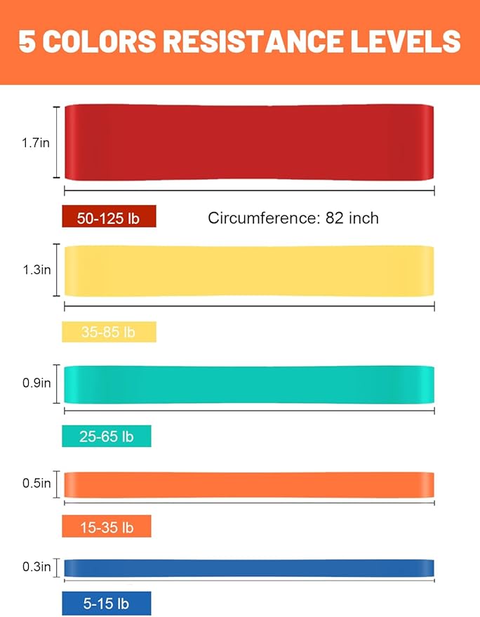 - Package Included: 5 pull up bands, 1 carrying bag and 1 workout guide. Resistance bands are 5-15 lbs, 15-35 lbs, 25-65 lbs, 35-85 lbs, 50-125 lbs. Use these exercise bands to perform rows, pulls, raises, and fly workout sets to exercise your arms, back, hips, legs, chest, and abdominal region