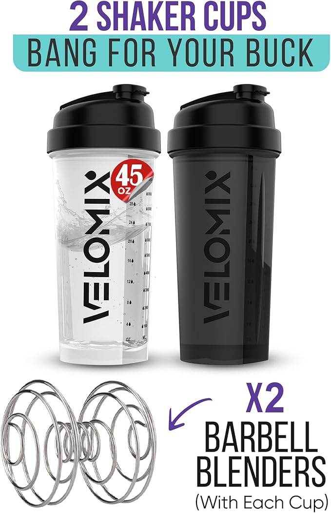 -2 Pack- 45 oz Protein Shaker Bottles for Protein Mixes - 2x Wire Whisk | Leak Proof Shaker Cups for Protein Shakes | Protein Shaker Bottle Pack | Shakers for Protein Shakes-Black&Transparent