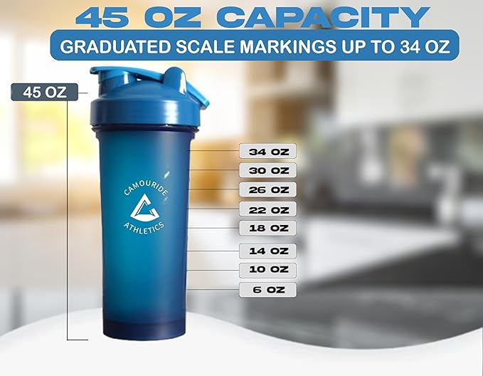 - [EXTRA-LARGE 45 OZ CAPACITY]: Fuel longer with our 45 oz protein shaker cup that holds over 1300ml. These protein bottles shakers keep you hydrated before, during, and after workouts—perfect for those who hate mid-session refills