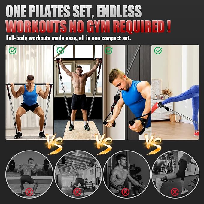 - 【Full - Body Home Gym Experience】The Pilates bar kit with resistance bands is a multi - functional workout tool. Use it for yoga, Pilates, stretching, resistance training, squats, weightlifting, and more. It targets various muscle groups including the upper body, glutes, and legs. Ideal for strength training, physical therapy, weight loss, body shaping, and flexibility improvement, it's a great substitute for traditional strength training gear like barbells, rowing machines, and bench presses.