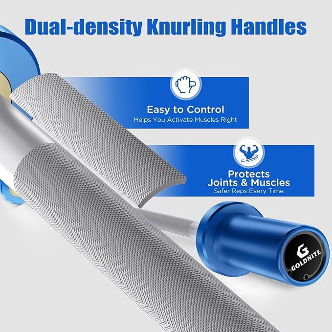 - Ergonomic Textured Grip&Balanced Design: GOLDNITE mini barbell bar is specifically engineered for petite users. Crafted with dual-density textured grips and optimized weight distribution, GOLDNITE 5.5 lb mini barbell ensures maximum control during lifts. Ergonomic grip spacing prevents shoulder strain during presses, while a lightweight build enables bedroom-to-gym transitions
