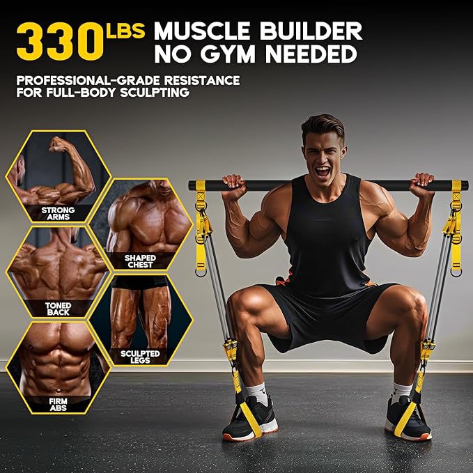- 330lbs Adjustable Resistance for All Levels: Includes 6 high-strength latex bands (2x45lb, 2x55lb, 2x65lb) for up to 330lbs of resistance. Whether you’re a beginner or advanced, customize your workout and progress at your pace. The tear-resistant bands handle daily abuse while keeping workouts smooth and effective.