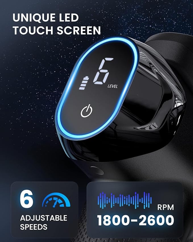 - 6 Massage Heads & 6 Speed Levels - Select from 5 standard massage heads to target different muscle groups and adjust the massage intensity from 1 to 6 (up to 2600 percussions per minute) for a deeper, penetrating muscle massage.