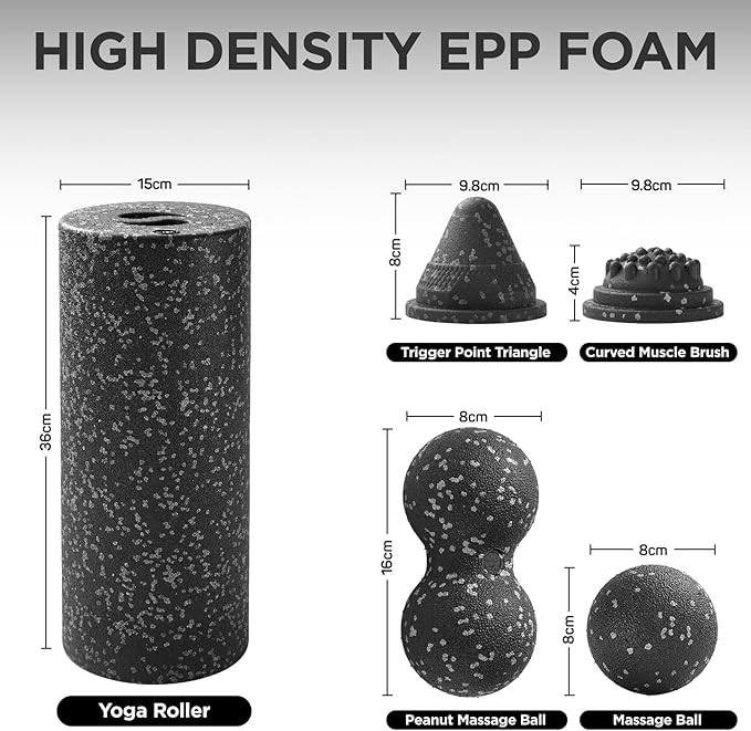 - 🌀 ​Hollow Design Integration System- Features an innovative ​hollow-core yoga roller​ that stores the ​peanut massage ball​ and ​fascia ball, securely sealed with the ​curved muscle brush​ and ​triangle massage cone. Assembled, it matches the size of a standard foam roller (14.5 inches) for seamless storage, while instantly transforming into ​5 specialized tools​ when disassembled.