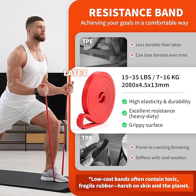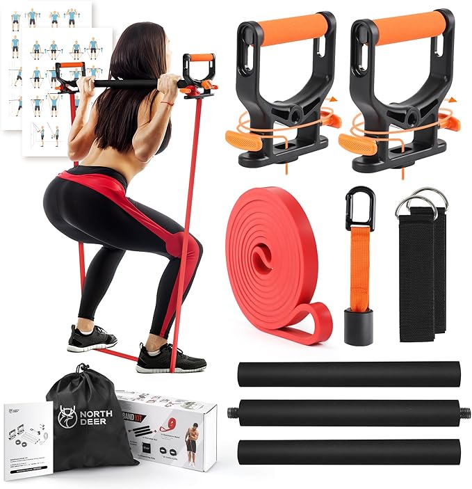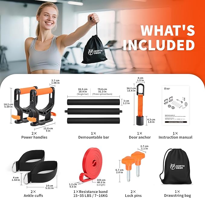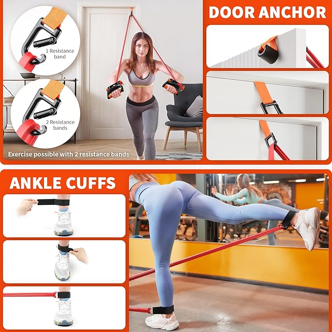 - All-in-One Fitness Solution: This complete set includes everything you need for a full-body workout: 1 high-resistance latex band (15~35lbs), 1 detachable steel rod (extends up to 31.3 inches), 1 heavy-duty door anchor, 2 adjustable ankle straps, 2 Power Handles, a durable storage bag, and an illustrated exercise guide.