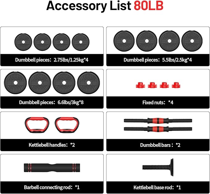 - WEIGHT PACKAGE LIST - 80 lbs fitness dumbbells include: 4 × 2.75lbs weight plates,4 × 5.5lbs weight plates, 4 x 6.6lbs weight plates,4x dumbbell nuts,2 × kettlebell handles, 1 × barbell connecting rod ,1 × kettlebell base rod and 2x dumbbell bars. You can choose different weights according to your own preferences to meet the intensity needs of you and your family at different stages of exercise