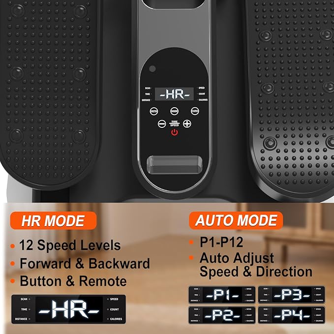 - AUTO & MANUAL MODE: This ellipse leg exerciser provides Auto (P1-P12) & Manual mode(12 speed levels) for your choice. Easily control the speed and intensity of your workout using the remote control. Pedals can move forward or backword to target your different muscle groups, achieve your fitness goals