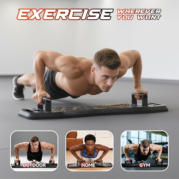 - ALL-IN-ONE STRENGTH TRAINING EQUIPMENT More than just a push up board, it's your compact strength training solution. Combine with the included handles for diverse exercises targeting upper body, lower body, and core. This versatile piece of home workout equipment supports a wide range of workouts from beginner to advanced levels, replacing multiple single-function gym tools