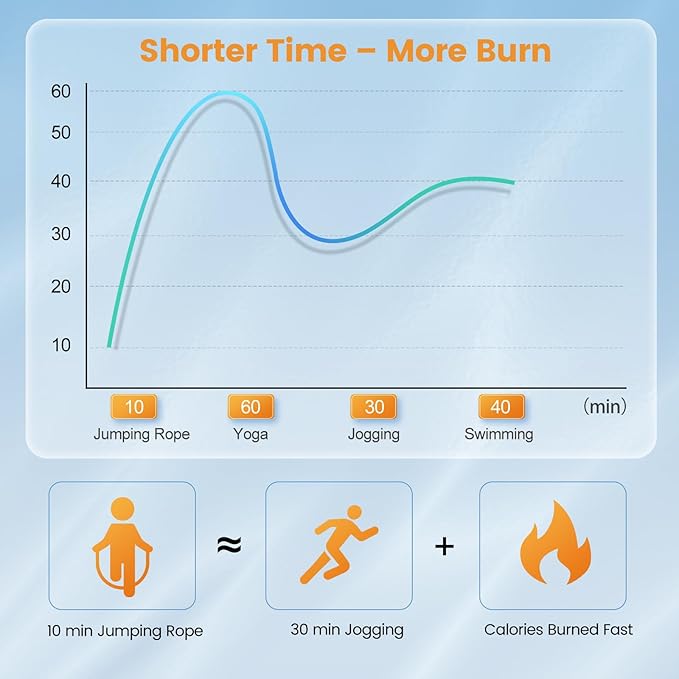 - More Jumps, Much Healthier: Jumping rope is ideal for all ages and skill levels. Strengthen your body, improve coordination, burn calories, and boost endurance. Whether you're indoors or outdoors, a beginner or a pro, you can start working out right away—solo or with friends and family, making it a daily habit.