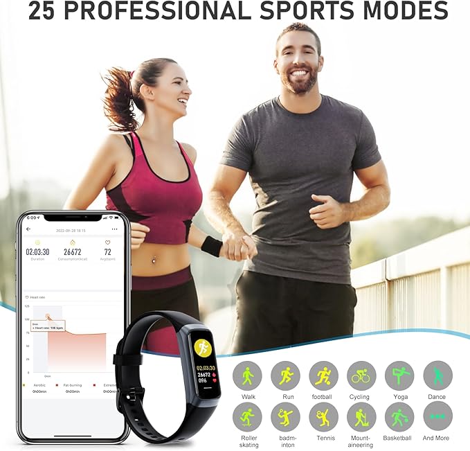 - 【25 Sports Modes】 Fitness tracker supports 25 professional sports modes, you can choose any number of sports modes as your exclusive sports modes in the app, such as walking, running, swimming, yoga, etc. and track your steps, heart rate, distance and calories to help you stay motivated, accomplish your sports goals, record your sports data, and make your sports more scientific.