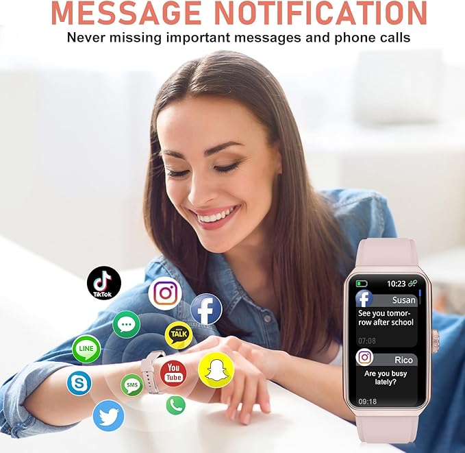 - 【Smart Message Reminder & Calls Notification】The fitness tracker can receive phone calls and social media notifications (including Facebook, Twitter, WhatsApp, and Instagram), allowing you to view the caller's name, reject calls, and read entire text messages directly on the fitness watch.